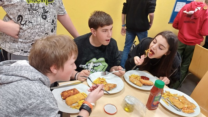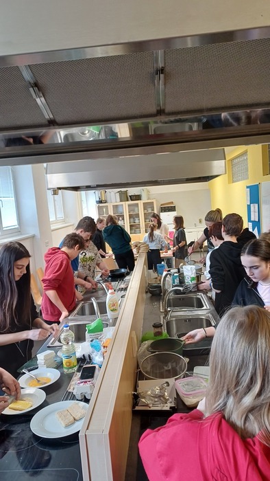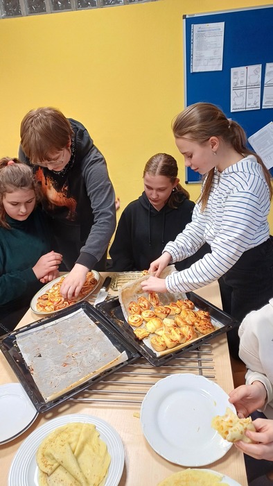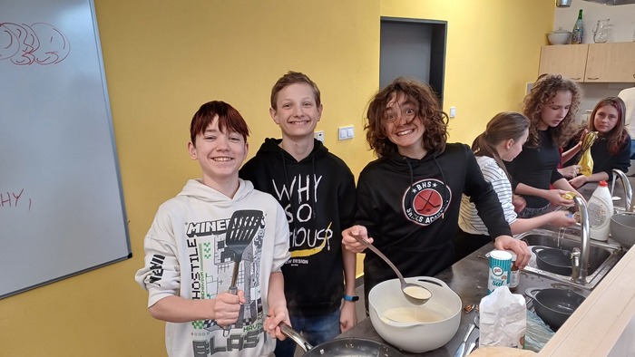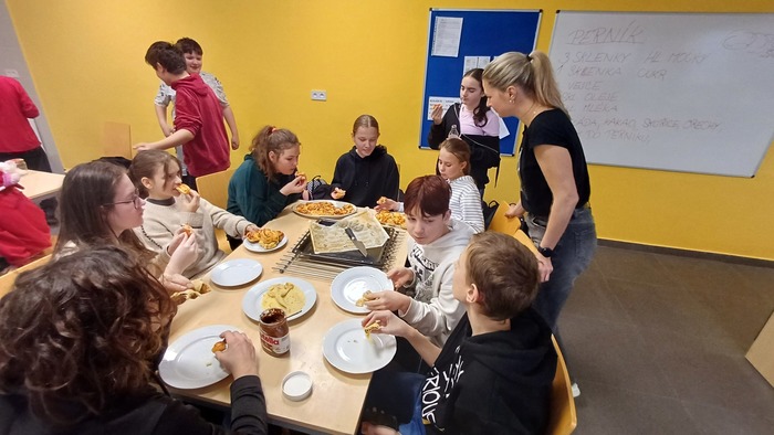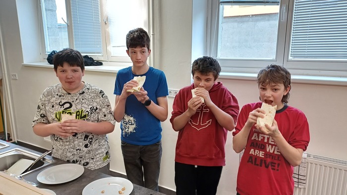 Ve středu 12. 3. 2025 jsme šli se třídou vařit. Rozdělili jsme se do skupinek a v nich si řekli, co budeme vařit. Moje skupina dělala smažený sýr a hranolky. Když jsme přišli do kuchyněk, každý začal pracovat. V naší skupince jsme se rozdělili do dvojic. Jedna začala připravovat sýr, druhá loupala brambory. Hned, co se začalo vařit, z každé strany bylo cítit něco jiného. Brownies, palačinky, tortilly a pizza šneci. Co jsme si uvařili, to jsme si snědli. Ale také jsme si dali ochutnat navzájem. Líbilo se mi, že jsme spolupracovali a všichni jsme si to užili. Určitě bych to chtěla zopakovat.