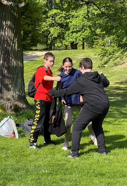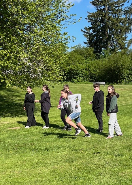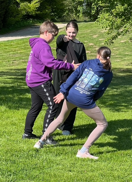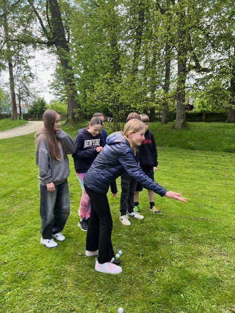 Na závěr nás čekal Telčský pětiboj v parku, kde si žáci vyzkoušeli nejen sportovní disciplíny jako hod na cíl nebo slalom, ale i týmové úkoly – například pantomimu nebo vědomostní mini-kvíz o Telči.