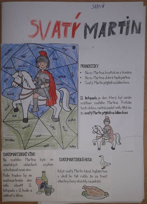V pátek 10.11. proběhl ve třídě 3.B školní projekt na téma svatý Martin. Žáci si nejprve otipovali otázky, které se týkaly sv. Martina. Poté si přečetli text a odpovědi si zkontrolovali. Seznámili se s dávnými zvyky a tradicemi, které se k tomuto dni vztahovaly. Dále pomocí příkladů sestavili rčení a pranostiky, které jsme si vysvětlili. Výstupem celého projektu byla mini knížka týkající se života, tradic, pranostik na den sv. Martina.
