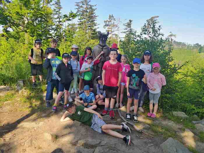 V pátek 2.6. jsme se vydali na výlet po okolí Javořické vrchoviny. Autobusem jsme se přesunuli na Olší, kde jsme zahájili výlet návštěvou místního lanového centra, odtud jsme vyšli na vyhlídku Bradlo, kde jsme viděli sochu čerta. Z Bradla jsme pokračovali k Hadravské studánce a rybníku Hadrava, dále kolem Hradiska do Práskoles k památné lípě. Výlet jsme zakončili v Mrákotíně, kde jsme měli domluvený  oběd v restauraci Na Kovárně a stihli jsme i výbornou zmrzlinu, která nám udělala sladkou tečku na závěr povedeného výletu. Počasí nám přálo, nálada byla veselá, takže jsme si výlet všichni moc užili.