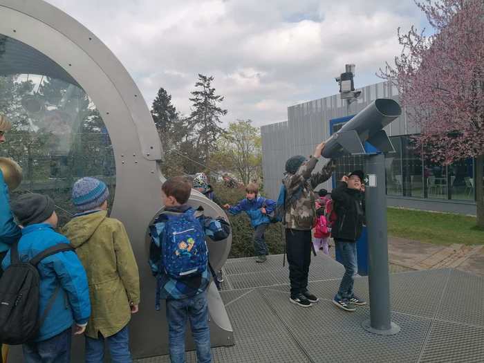 Poté jsme přejeli do planetária na rozkvetlou Kraví horu. V digitáriu jsme měli přednášku o hvězdách, souhvězdích a planetách. Na závěr děti shlédly krátký film o krásném podmořském světě. Nakonec jsme si prohlédli výstavu mlhovin. Obrovské fotografie děti zaujaly. Ve venkovním areálu planetária si mohli žáci vyzkoušet různá zařízení. Např. kosmické vozítko nebo vesmírnou váhu, která ukazovala hmotnost žáka na všech planetách. Posledním úkolem bylo najít ztroskotanou loď UFA. I to se nám podařilo a mohli jsme pokračovat na naši poslední zastávku.