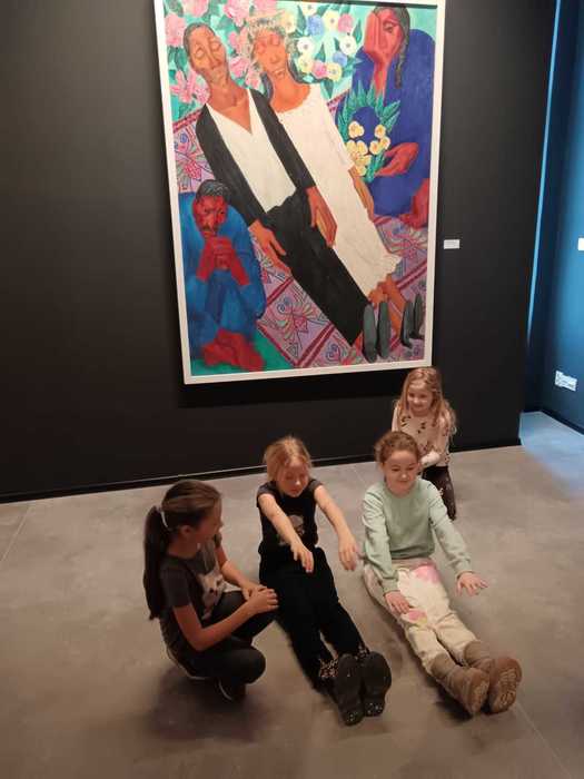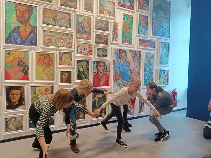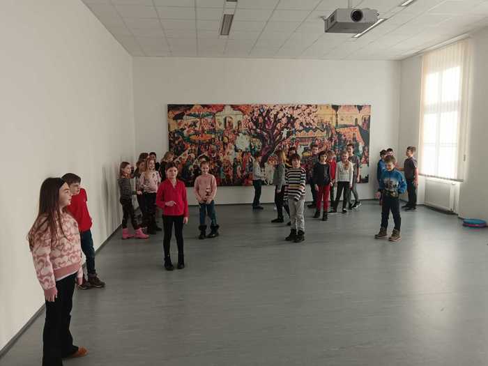 Druhá část programu probíhala v galerii. Žáci se rozdělili do skupin a vybrali si obraz, který měli předvést pomocí živého obrazu. Dle své vlastní fantazie měli doplnit příběh obrazu, který by mohl následovat. Vymyšlenou scénku předvedli ostatním spolužákům.