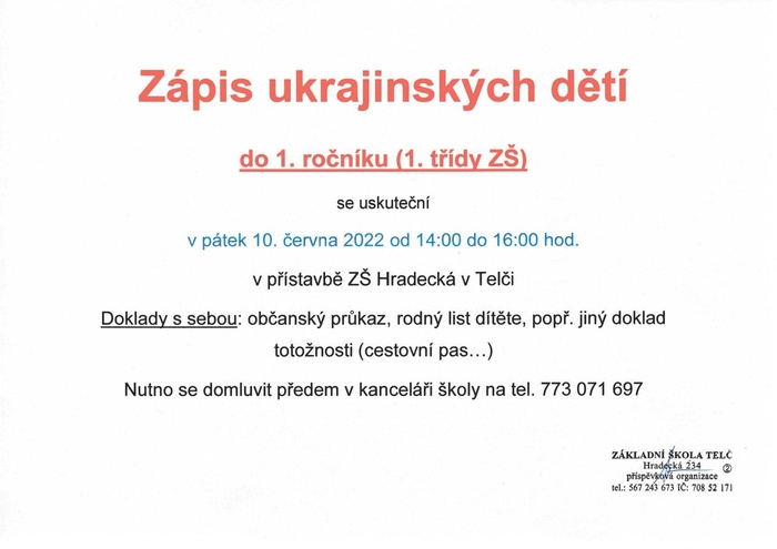 Úvod > Škola > Informace ze školy > Zápis ukrajinských dětí do 1. ročníku